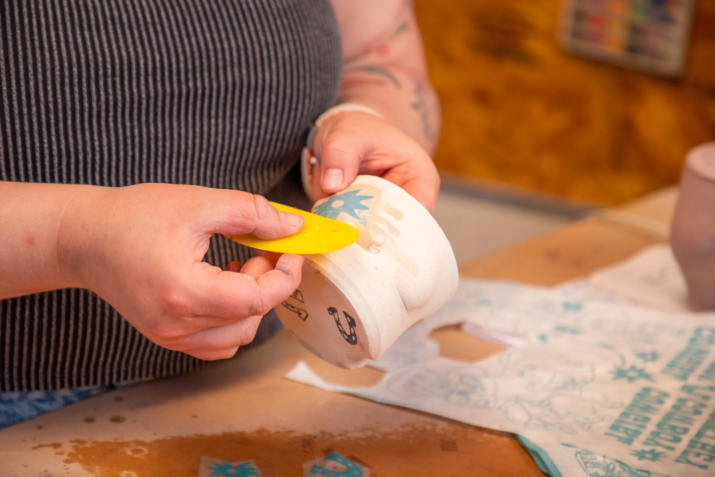 Underglaze Transfers: Designing and burning custom underglaze transfer designs, screen printing underglaze designs onto rice paper, using mixing medium to make underglaze ink, drying and rehydrating underglaze transfers.